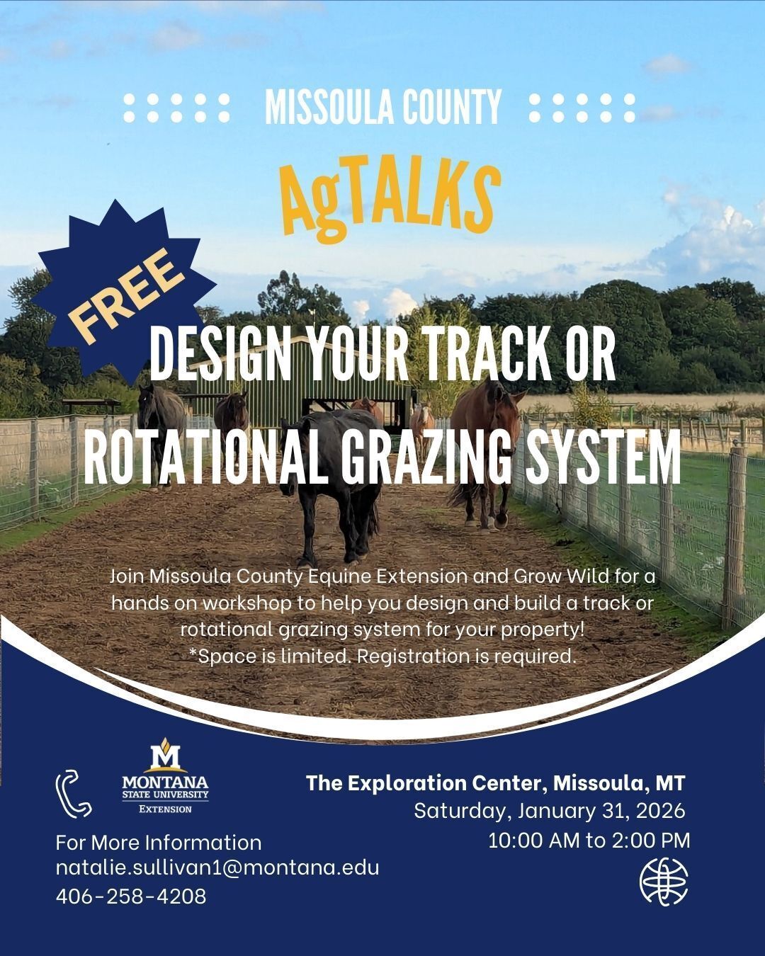 Join your local Missoula County Equine & Livestock Extension Agent and Jennifer Mohler from Grow Wild for a hands on workshop to help you design and build a track or rotational grazing system for your property! Space is limited to 20 land stewards. Registration is required.