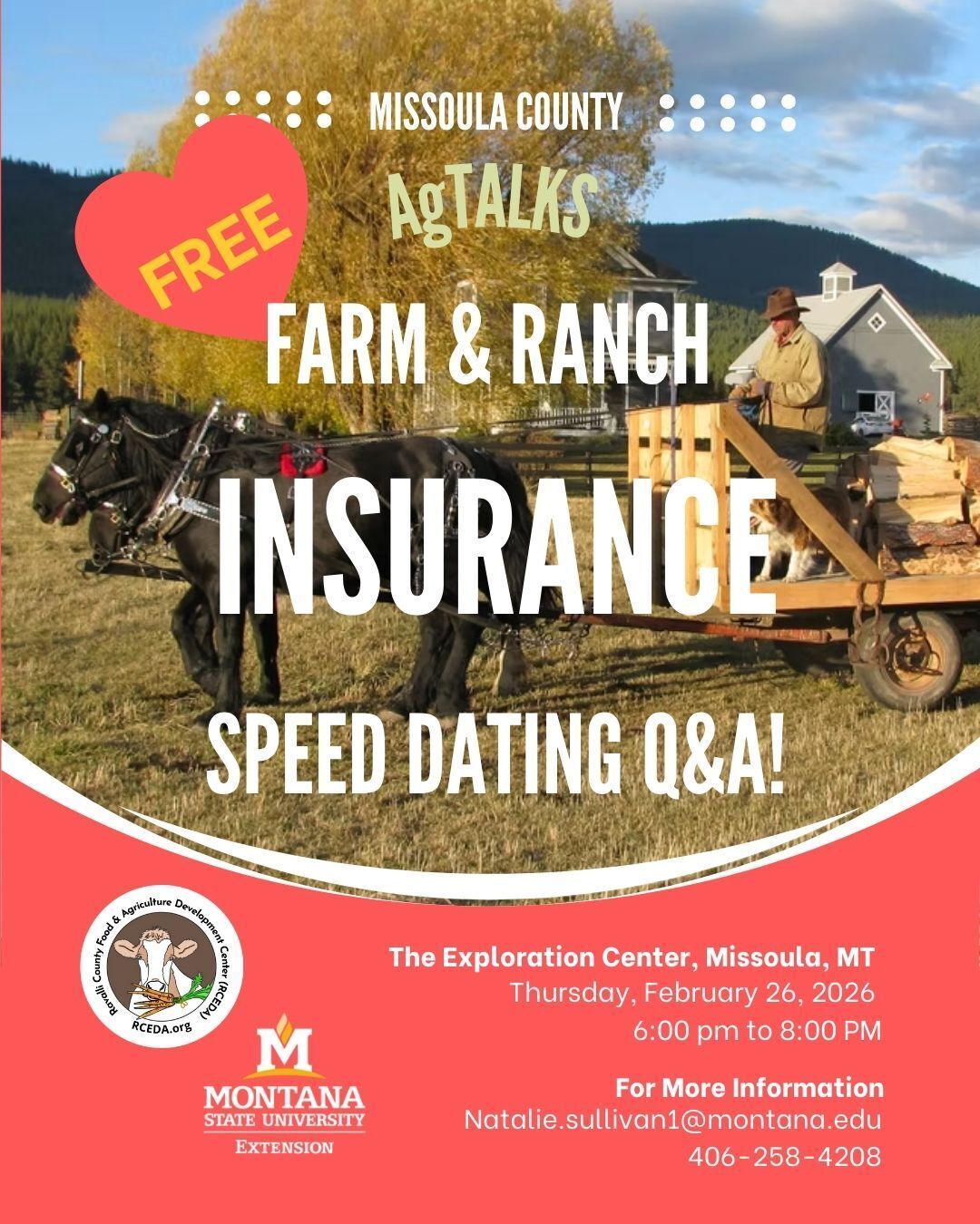 Ok, it's not actually dating, but it is February, and we are looking for matches! It's fast, fun, interactive learning with a panel of local agriculture and farm insurance specialists! We will be tasking each of 6 insurance agents with a unique farm/ranch/equine insurance topic to highlight the important points of what you need to know. General farm liability, agribusiness, workers comp, machinery and outbuildings, livestock and equine mortality and liability, and farm product insurance are topics that will be covered by agents from Stockman Insurance, State Farm, Marsh McLennan, Farm Bureau and Montana State Fund. You'll walk away with the confidence that you are or are not covered appropriately. Join us at the Exploration Center for a FREE February AgTalks: Farm & Ranch Insurance Speed Dating Q&A!