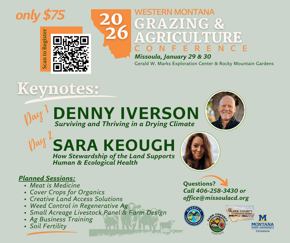 The Missoula Conservation District, MSU Extension, Farm Connect of Montana, and the Lake County Conservation District are excited to host the 2026 Western Montana Grazing and Agriculture Conference, January 29-30 in Missoula, MT. This conference will bring together ranchers, farmers, policy makers, industry leaders, resource professionals, students, and researchers for a full two-day educational event. Last year’s event hosted over 125 participants. This 2-day event will be a wonderful opportunity to network with Montana’s diverse agricultural community! Please consider registering or even sponsoring today.