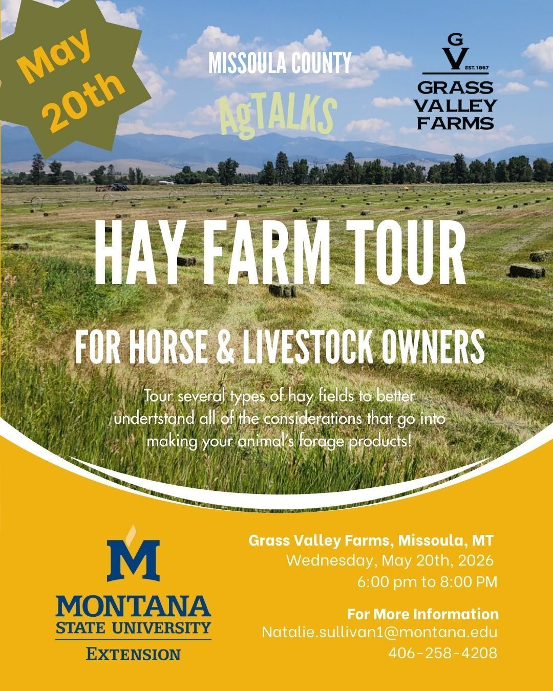 MSU Extension and Grass Valley Farm are excited to welcome you to the first annual Hay Farm Tour in Western Montana. Whether you're new to animal husbandry or have owned animals for a lifetime, you may never had had the opportunity to see a hay field from the eyes of the grower! During the evening's tour, you will walk timothy grass, bluegrass, and alfalfa fields and learn about the inputs, environmental factors, and machinery considerations throughout the growing and harvesting. You'll learn that growing hay is more like an artistic endeavor than a mechanical process. This is your chance to smell, touch, taste and see the product before it reaches your farm. Meanwhile, you MSU Extension agent, will guide you through forage analysis tests on each field to understand how those growing and harvesting factors affect your animals. It's going to be a really interesting event, so don't miss out!